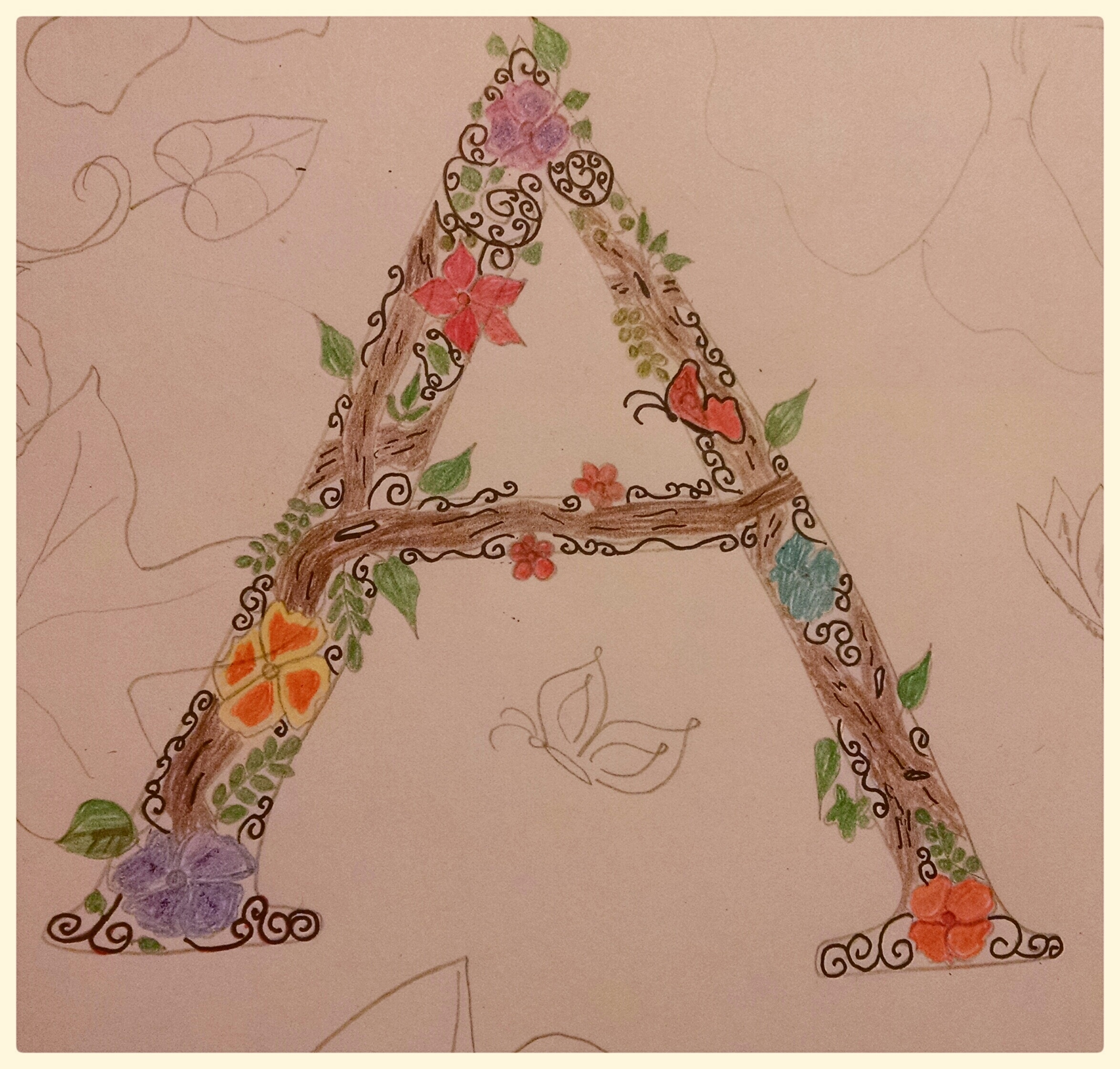 For years I believed I couldn’t draw. Probably because my mom tried to teach me and my mom is rather talented so when my first attempts didn’t surpass hers, why bother? (I’m not competitive at all, can’t you tell?) But in delving deeper into the art of calligraphy I discovered that I would need to become someone who could draw. Those nice loops gracing the letters? I had to be able to draw pleasing circles. I want to have an illuminated border? Drawing. Flowers? Drawing. So I’ve begun teaching myself. Here’s a botanical letter, inspired by a post from this website. I want to make a few changes when I do this “for reals” (it’s going to go into my daughter’s room) but overall I’m pleased with this first attempt.