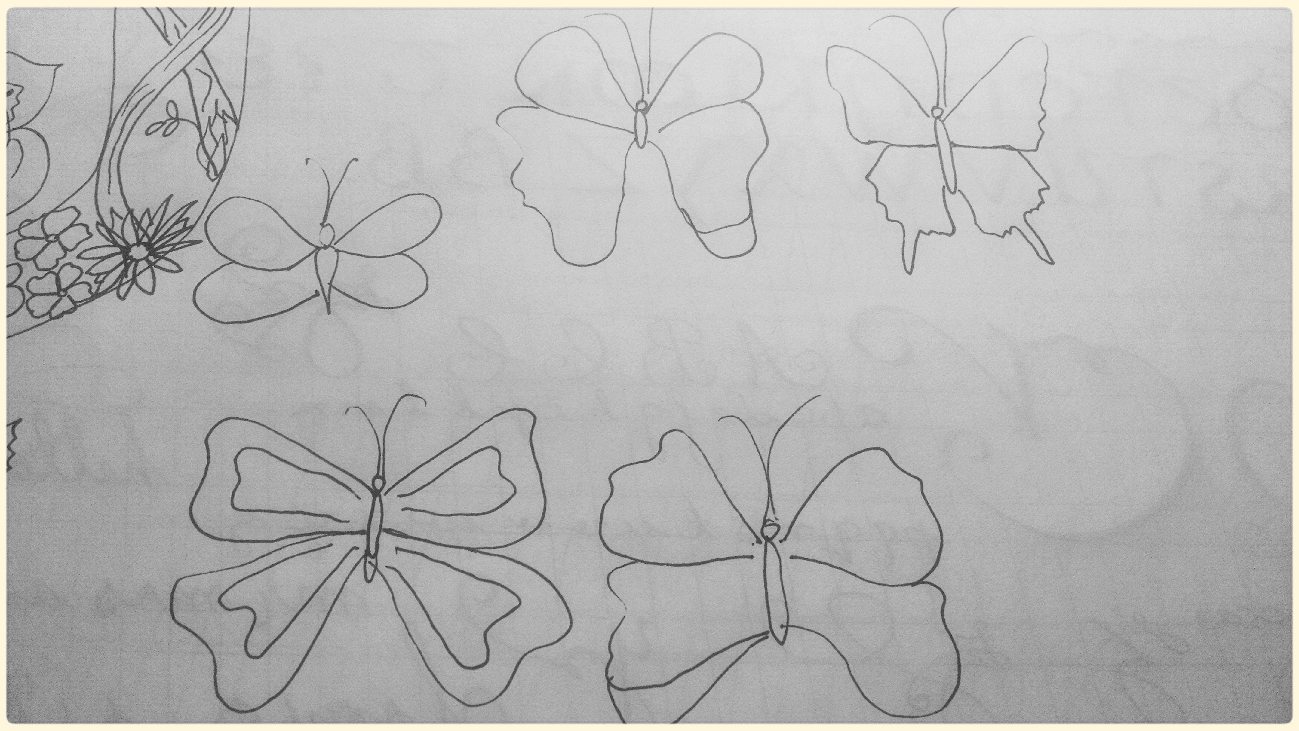 And here are my attempts to draw butterflies. I have issues with making sure the spacing is even on both sides. I’m working on visualizing it; once I can see it clearly in my head usually it comes out on paper. I’m determined to have serviceable butterflies; a friend likes them and I’d like to incorporate into the artwork I make for her.