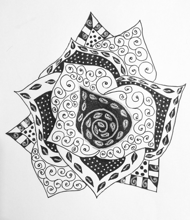 My flower. Again, I’m practicing repetition, building my tolerance for incorporating details. I love love love sticking to black and white. It’s quite striking.