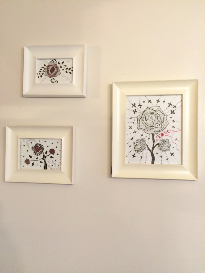 You can find these pieces in my etsy shop, wordsremember. Use the coupon code ROSE3 (through April 30) for 15% off the set! The frames are not included in the price. Also be aware that these are made to order and allow a couple of weeks (or more, but I’ll let you know up front) for me to draw them and ship! (There might be slight variations to the roses; I’ll stick as close to the original as possible but I’ve noticed I usually make small changes. It won’t affect the integrity of the work and your roses will still be beautiful.)