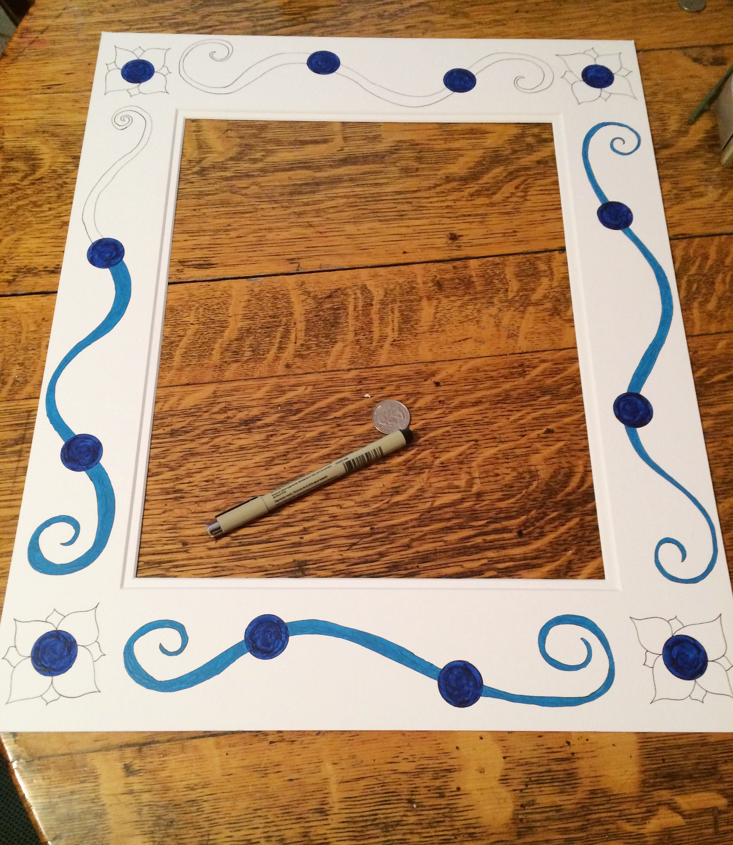 I am going to be immortalizing my brother and sis-in-law’s wedding vows sometime this year and I thought up a cool idea for it. Rather than decorating the edges of the paper I use for the calligraphy I’m decorating a mat cut for an 11×14 piece. Also, this way if I mess up any part of their rather lengthy vows I don’t have to start completely over😉