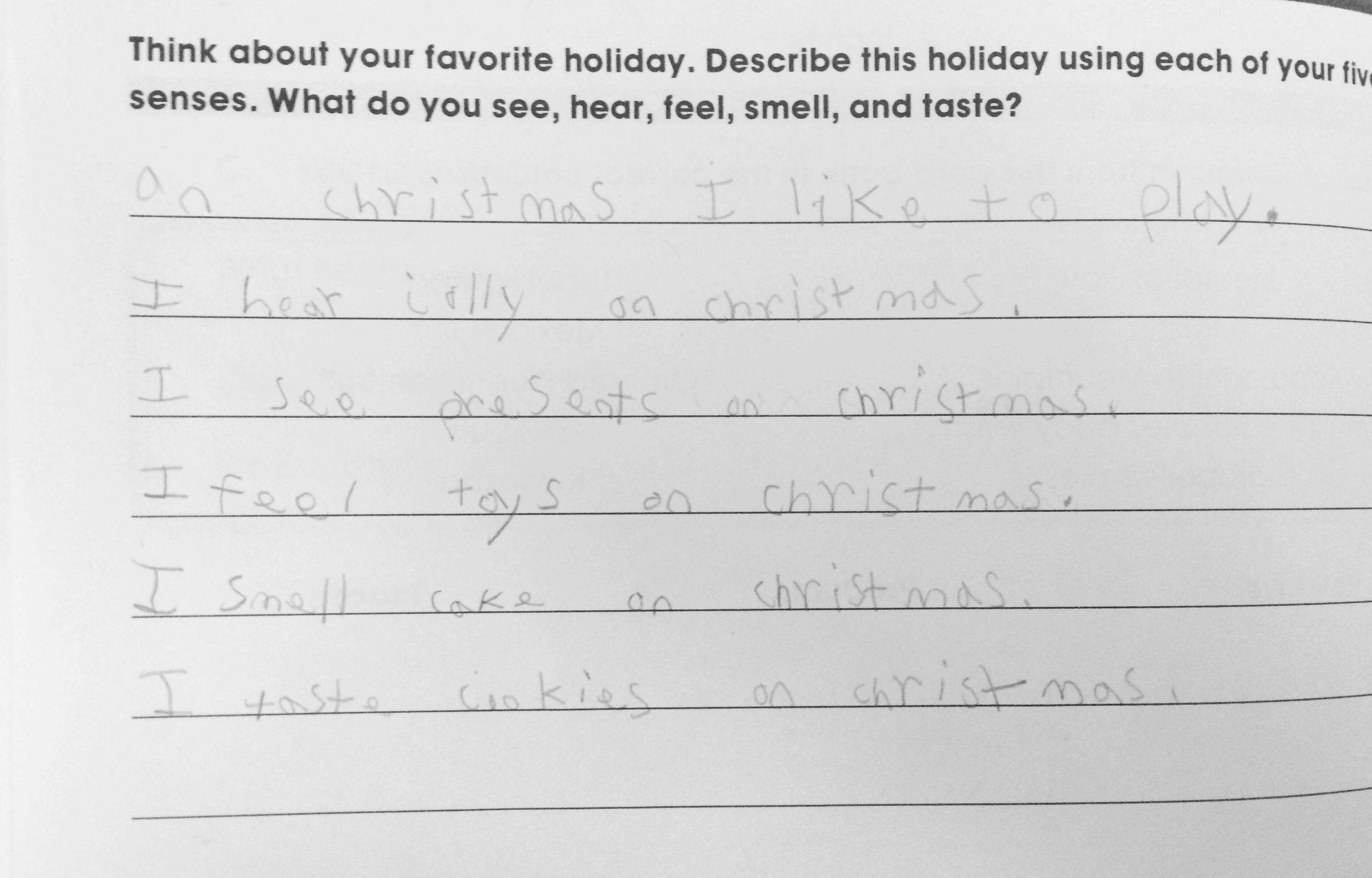 In case you can’t read the words, our eldest, code name Scarlet Witch (who graciously gave permission to publish this) wrote the following for a school assignment (which was to describe Christmas using the five senses):