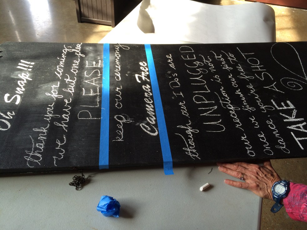 The wedding was amazing. Gorgeous, memorable, all those things. My brother and (now!) sister-in-law know how to throw a party. But. As their calligrapher, I learned a few things. Look at these signs: They look nice, right? I nonchalantly volunteered to do these signs thinking "how hard can it be? It's only chalk!" Turns out… Continue reading Some things not to do at your brother’s wedding.